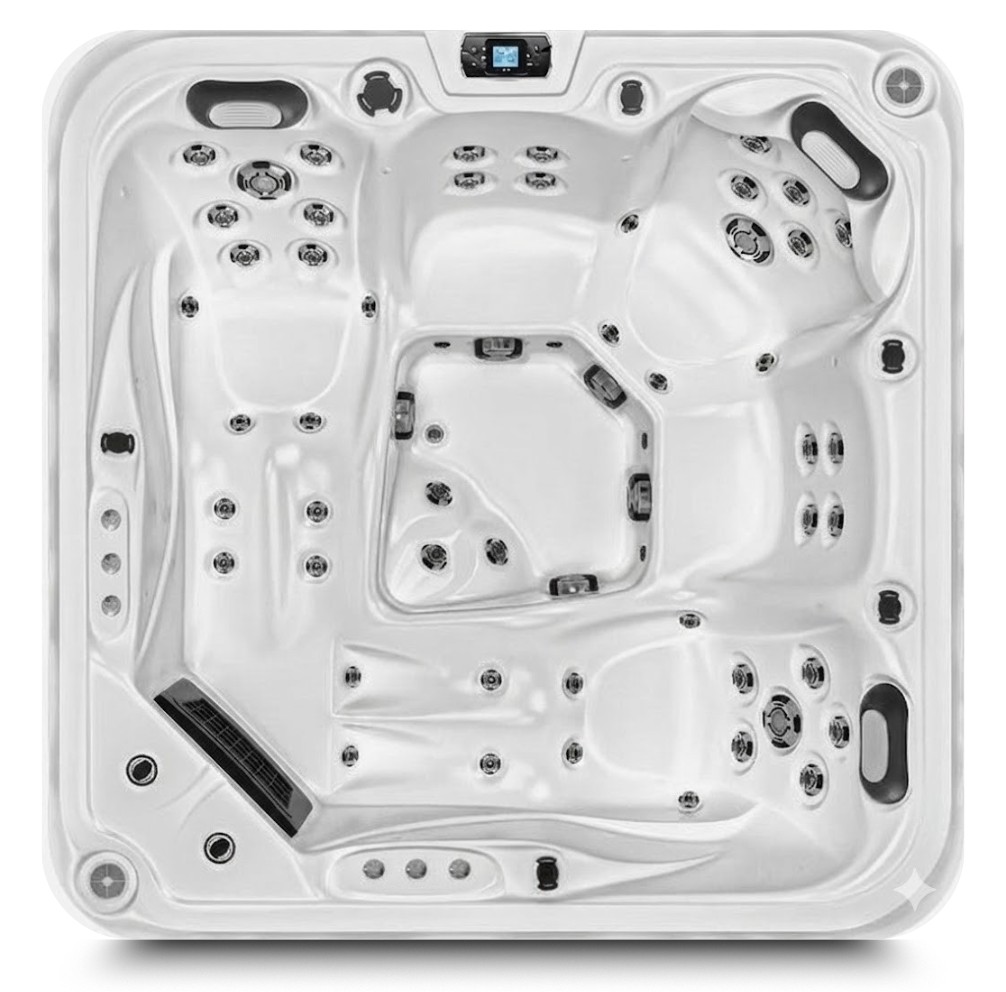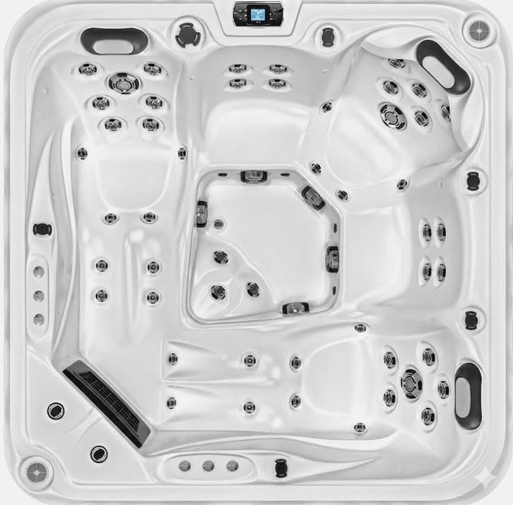 více fotografiíRozměr 2100 x 2100 x 930mm. Vířivka se dvěma lehátky a třemi místy pro sezení. Celkem 55 hydromasážních trysek s regulací tlaku masáže a 10 vzduchových trysek.
