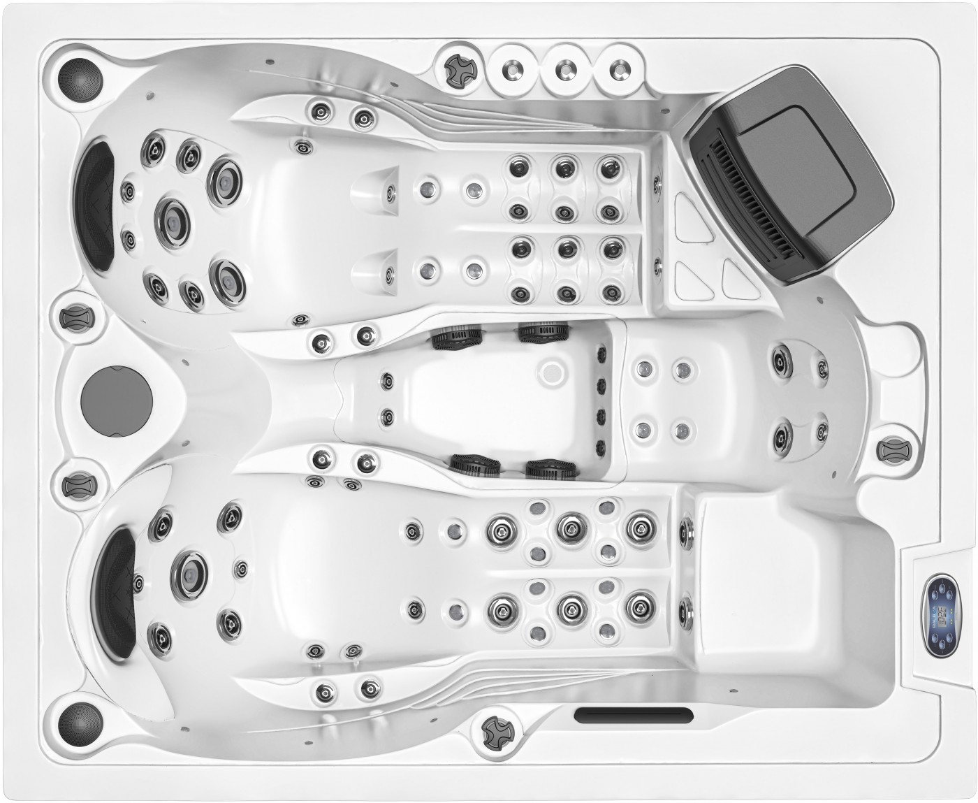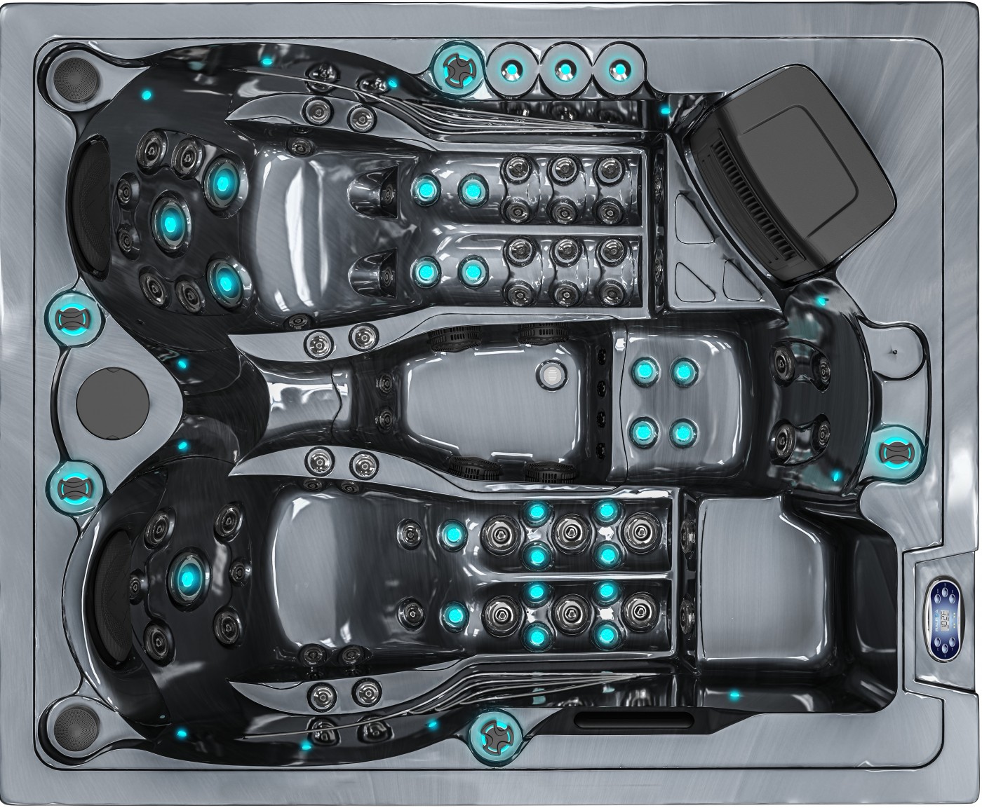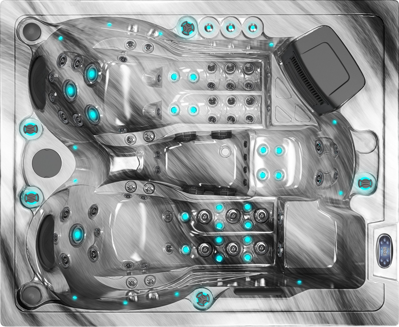 O účinnou masáž se starají dvě samostatná hydromasážní čerpadla GECKO FLO-MASTER o výkonu 3 HP, která zajišťují rovnoměrný tlak vody a možnost nezávislého ovládání každého lehátka.