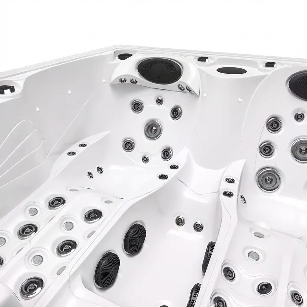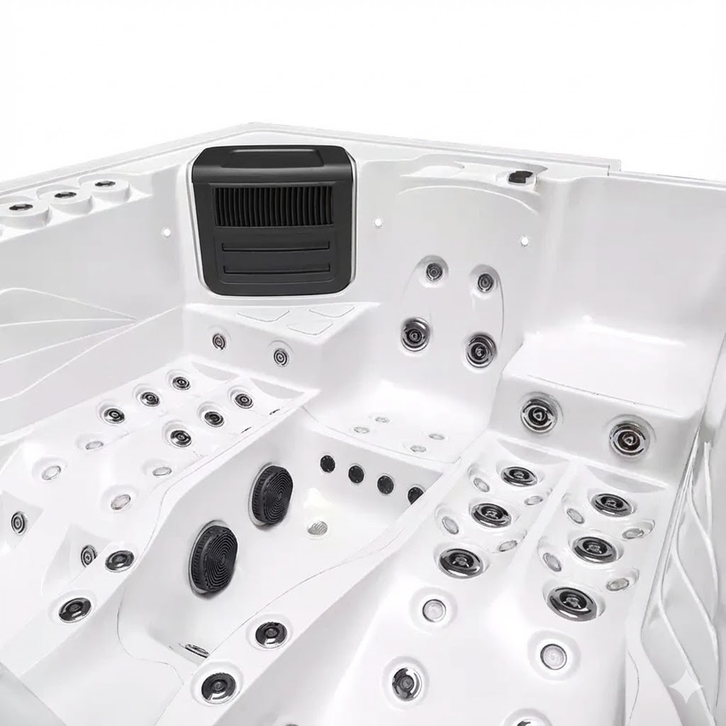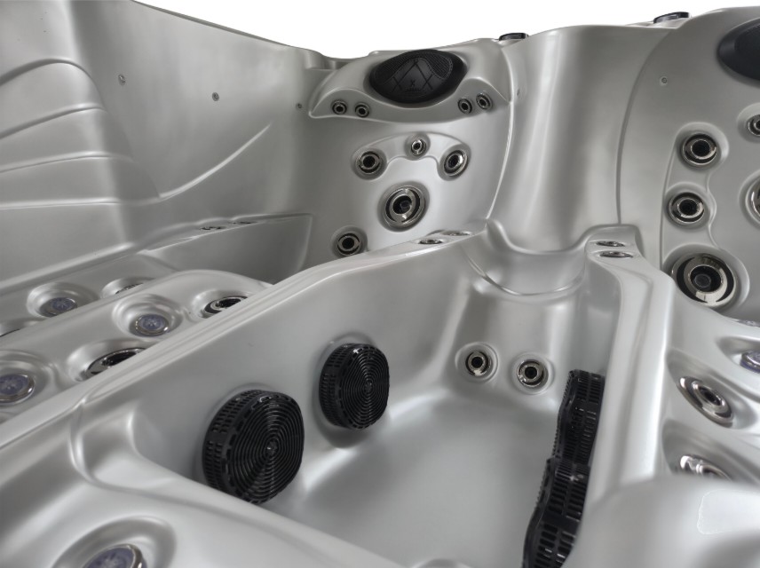 66× hydromasážní tryska s regulací (kombinace rotačních a přímých trysek různých velikostí), 18× vzduchová tryska, 2× regulátor tlaku,Akrylát, nosný rám a izolace: